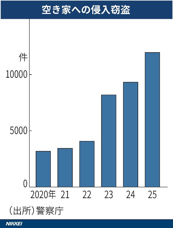 空き家を狙った窃盗事件が急増している。2025年の侵入盗は1万1958件と初めて1万件を超え、2020年の約3.7倍に達した。背景には、入院や施設入所などで長期不在となった住宅に金品や家財が残されているケースが多いことがある。窃盗グループは郵便物の滞留や庭の手入れ状況に加え、門扉に石を置くなどして不在を見極め、犯行を繰り返していた。