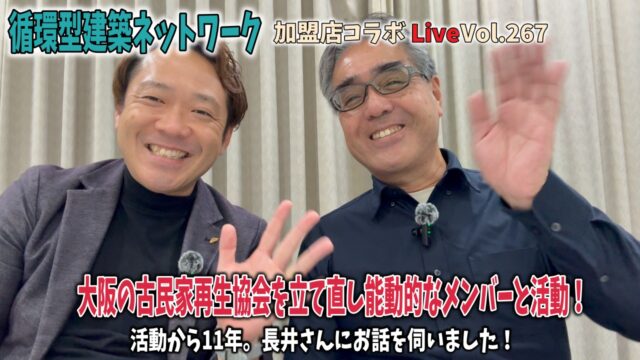 Posted on 2025年11月10日 By kawano masahiroPosted in ■循環型建築ネットワーク(古民家ネットワーク) 先週の加盟店コラボライブは2014年にご加盟され大阪府で古民家再生協会を運営する長井さん。 大阪府は前任者もいた地域であり、古民家再生協会の再結成から暫くはメンバーにも恵まれない時期がありましたが、 理念に忠実に諦めることなくコツコツ活動をおこなうことで、大阪府内に2支部が誕生し、 33名のメンバー(第1支部・第2支部)で活動する協会へと成長してきました。 まだまだ活動を止めることなく進む、長井さんにお話を伺いました! ぜひご覧ください!