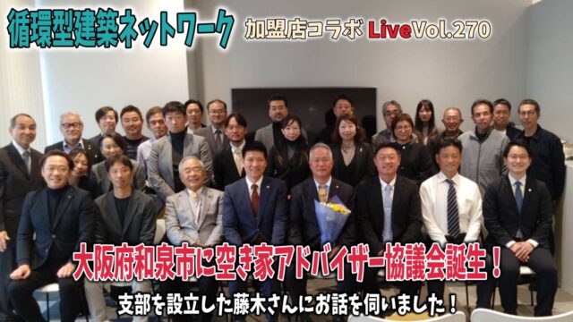 コラボライブ270話目 Posted on 2025年11月30日 By kawano masahiroPosted in ■循環型建築ネットワーク(古民家ネットワーク) 今週の加盟店コラボライブは今年ご加盟され11月24日に支部設立総会をおこなった大阪府和泉市の藤木さん。想いと抱負をお伺いしました!